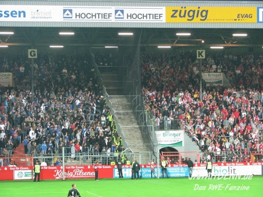 Die Betonung liegt eben auf „Fan“ und stellt diesbezüglich keinen Rechtschreibfehler dar, aus meiner heutigen Sicht jedenfalls. Wir erinnern uns: Es war der 31.Mai dieses Jahres und der Sieg gegen den VfB Lübeck nebst damit verbundenen Klassenerhalt schien nur noch Formsache. Das Ende ist bekannt und die Hafenstrasse zeigte im Anschluß Szenen, die keiner sehen wollte. Gestern dann der Heimspielauftakt in den Niederungen der Viertklassigkeit. Trotz des Sieges in Lotte wusste wohl kaum einer das Interesse an diesem Spiel gegen die Zweite aus Gelsenkirchen einzuordnen. Nur, dass der Derbyfaktor auch einige Gästefans und Erlebnisorientierte anlocken würde war klar. Das aber dann 11.380 Zuschauer das Spiel sehen, die Mannschaft begeistert empfangen und unterstützen würden, damit hat wohl keiner gerechnet. Die RWE Fans Nordhorn wurden übrigens einmal und eine Frau mehr von der „Sektion Ochtrup“ unterstützt. Das Spiel dann war ziemlich schnell eine klare Angelegenheit für die Roten. Da ist „Zug“ drin in der Mannschaft, ein klares System zu erkennen , selbst beim Stande von 4:0 wird noch dem Ball hinterhergegrätscht, die Auswechselungen ergeben Sinn und denselbigen sieht die Mannschaft auch darin, sich mit den Fans zu identifizieren. Mehr davon, und die Ligazugehörigkeit spielt keine Rolle mehr. Den Menschen auf den Rängen war anzumerken, wie sehr sie sich nach so einem Spiel gesehnt haben. Klasse Fußball. Auf die weitere Entwicklung dieser Mannschaft bin ich sehr gespannt. Gespannt waren wir zwischenzeitlich auch auf die Lösung, wo Bernd für fast 20 Minuten abgeblieben war. Seine Version: Ich habe mich verlaufen und beim Tor wurde mir das Bier einfach „entwendet“…. oder war es andersherum. Viel Atmosphäre gibt es hier nachzuvollziehen.