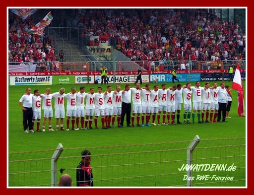 Dieses Spiel und das historische “Vorspiel” in Worte zu fassen fällt mir schwer. Es war wunderbar und melancholisch zugleich. Wie schnell kann die Spezies Fußballfan doch eine gnadenlos verkorkste Saison auf und neben dem Feld vergessen. Da können Vermarkter und private Fernsehanstalten noch so versuchen, den Fußball in der Sommerpause irgendwo zwischen Hüttengaudi und Ballermann zu platzieren, den wahren Fan juckt das nicht. Hier wird die fußballlose Zeit als Keimzelle genutzt, aus der wohlbehütet Hoffnungen und Wünsche für die kommende Saison heranwachsen. Ein langgehegter Wunsch, zwischendurch eher eine Burleske, ging zwei Stunden vor Anpfiff in Erfüllung: Der offizielle Anstoß für den Neubau wurde durchgeführt. Ich fand es sehr erfrischend, dass im Gegensatz zu sonstigen, ähnlich gelagerten Anlässen, nicht nur in Superlativen geschwelgt wurde: So ging Essens Oberbürgermeister sehr dezidiert auf das “warum” in Anbetracht der Haushaltslage ein und ließ auch die schlechten Leistungen auf dem Feld nicht unerwähnt. Der Wunsch nach einem neuen Stadion wird Wirklichkeit und macht nun für einen längeren Zeitraum Platz für verklärende Erinnerungen an das Georg Melches Stadion. Es tut weh, dass Peter diese Momente nicht mehr im hier und jetzt erleben darf, aber wir waren uns sicher: irgendwo nimmt er an dieser “Party” teil und redet gerade jemanden vor lauter Vorfreude schwindelig. Nun aber zu den wirklich wichtigen Dingen, den Protagonisten auf dem Feld, welchen das Stadion wahrscheinlich nicht wirklich wichtig sein dürfte. Aber Hauptsache, die Identifikation mit dem eigenen Verein (=Arbeitgeber) stimmt. Und die stimmte am Samstag schon vor Anpfiff, als sich das ganze Team nebst Trainerstab den 8560 Fans präsentierte. Engagiert dann das Spiel, unübersehbare Abstimmungsprobleme inklusive. Die fielen aber nicht so ins Gewicht, da die Lauterer nach vorne hin zu Beginn sehr unsortiert waren und zum Schluss auch noch vom Pech verfolgt wurden. Und, ganz wichtig: Auf Seiten des RWE wurde gerannt, gegrätscht und auch mal “umgewemmst”. Das kam an und wurde mit “So spielt man Fußball in Essen” dankbar quittiert. Aber es gab auch wieder eine Spieleröffnung mit langen Bällen nach vorn, gefährliche Standards und mit Sebastian Stachnik endlich die erhoffte Entlastung für Sascha Mölders. So wurde denn 2:0 gewonnen in einem Spiel, welches ob der Vorzeichen unbedingt gewonnen werden musste. Diese Nervenprobe wurde bestanden und mit Dauergesang der Fans belohnt. Auf eine Humba wurde zum Glück verzichtet, auch da haben alle Beteiligten dazugelernt. Danke an jawattdenn und den soziokulturellen für die Fotos.