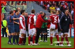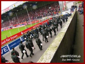 Bis zur 92. Minute war ich mir ziemlich sicher, dass der RWE dieses Duell zweier alter Rivalen für sich entscheiden kann. Dann der Eckball in der 93. Minute und schon vor dessen Ausführung war mir klar: Der Ball zappelt gleich im Netz, leider. Das spürt man einfach, so kam es auch und in Agonie verfallend, schweifte mein Blick über sich das nun bietende Spektakel: “Die” Haupttribüne, fast schon komplett stehend, sackte in kollektiver Verzweiflung in die Sitzschalen. Der vorher sitzende Rest outete sich nun als Fan der Münsteraner Preußen und wählte den entgegengesetzte Weg. Über 2500 Fans im Gästeblock sowie die Bank der Gäste flippten kollektiv aus; Die RWE Spieler sackten enttäuscht zu Boden oder “bedankten” sich bei den Unparteiischen und auf der Osttribüne wurde einmal mehr der Zaun auf seine Haltbarkeit hin geprüft. Das Endergebnis eines packenden Spieles lautete somit 1:1 Unentschieden. Doch ganz so einfach ist die Abhandlung dieses eminent wichtigen Spieles nun auch wieder nicht, dafür war es eine zu intensive Begegnung. 10.022 Zuschauer sorgten für einen mehr als würdigen Rahmen und füllten die verbliebenen Tribünen fast komplett. Rund um das Stadion zeugten jede Menge Polizei und Reiterstaffeln von dem Risikofaktor dieser Ansetzung. Zu Beginn eine kleine,schicke Choreographie und dann gab es erst einmal zwanzig Minuten von beiden Seiten “kräftig auf die Socken”. Erst im Anschluss beruhigte der RWE ein wenig die Partie und setzte auf spielerische Akzente. Ganz stark aber schon in dieser Phase des Spieles der Einsatz. Fast immer wurden die Preußen gedoppelt, bisweilen befanden sich gar drei Spieler in unmittelbarer Nähe des ballführenden Gegners. Dieser kam in der ersten Halbzeit zweimal gefährlich vor das rot weisse Tor, ließ aber sonst Effizienz und Spielfluss vermissen. Wieder wurde ein Tor des RWE nicht gegeben. Pause, durchatmen, hoffen und anfeuern. Und es wurde eine zweite Halbzeit geboten, wie sie der sorgengeplagte Dauergast an der Hafenstrasse seit Jahren nicht mehr gesehen hatte: Einsatz bis zum Umfallen, den Gegner fest im Griff, und eine Stimmung, die ganz zart wieder in Richtung “Mythos” tendierte. Belohnung war die schnelle Führung durch Sascha Mölders, der zwanzig Minuten später den berühmten Sack mehr als hätte zumachen können: Der Ball aber prallte von der Unterkante der Latte zurück in das Feld und einem anderen, völlig allein vor dem Tor stehenden RWE Spieler, vor die Füße. Über das anschließende Geschick, den Ball in hohem Bogen ÜBER die 17,86 m2 freie Torfläche zu köpfen, möchte ich den Mantel des Schweigens decken. Egal zu diesem Zeitpunkt, es wurde bei anhaltendem Regen weiter gerannt, geackert und gegrätscht. Die Hände waren rot ob der klatschhaftigen Unterstützung und die Stimme versagte auch langsam. Herrlich, Emotionen pur. Dann die erste Einwechslung und für mich der Bruch im Spiel. Patrick Schnier, rein äußerlich an Henry Charles Albert David Mountbatten-Windsor (genannt Prinz Harry) erinnernd, hatte eher mit seiner Standfestigkeit zu kämpfen als dem Spiel zu helfen. Zwei weitere Einwechslungen, die in Zeitlupentempo durchgezogen wurden, brachten noch mal frische Spieler, aber die anderen konnten einfach nicht mehr, zu viel Kraft hatte das Spiel bis dato gekostet. Teilweise schleppte ein Spieler den Ball in Richtung Münsteraner Strafraum, aber es konnte keiner mehr nachrücken. Preußen packte nun britische Tugenden, sprich “kick & rush” aus: Ball nach vorn, hinterher und gucken was geht. Und bis zur besagten 92. Minute ging auch nicht viel, immer stand oder lag ein RWE Bein im Weg. Es drohte alles gut zu werden. Nun sind wir aber in Essen, an der Hafenstrasse und bei RWE. Hier dauert ein Spiel nicht 90 Minuten, sondern meistens länger. Der Versuch, Zeit zu schinden rächte sich nun, denn es wurde auch bis zur 93. Minute noch weitergespielt. Endergebnis bekannt. Da der Fußball nun mal kein Konjunktiv ist, gilt es auch dieses Spiel abzuhaken und den wahnsinnigen Kampfgeist hervorzuheben. Das Spiel zwar nicht gewonnen, aber der RWE hat wieder eine Mannschaft,darauf lässt sich doch aufbauen.Im Anschluss dann ging die mit Spannung erwartete Taktik der dritten Mannschaft an diesem Tag auf: Die Polizei ließ den abwandernden Fans die Möglichkeit, die Hafenstrasse in alle Richtungen zu benutzen und die vielen Preußen Fans trotzdem fix in die Busse und zum Bahnhof zu befördern. Für einige “Fans” in rot und grün, die sich trotzdem vor und hinter der Polizeikette zum netten Gedankenaustausch versammelten, wurde wohl der Begriff “Fremdschämen” erfunden. Was für ein Spiel.