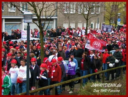 Bei genauerer Betrachtung erscheint die Teilnehmerzahl dann aber doch nicht mehr so gering, für mich sogar überraschend hoch. Die im Vorfeld erwartete Anzahl von 5.000 Teilnehmern empfand ich etwas unglücklich angesetzt, steckt doch die Faninitiative in Essen noch in den Kinderschuhen und muß die Szene in Essen erst einen gemeinsamen Konsens finden. Aufgrund dieser Tatsachen, und der selten blöden Niederlage gegen die Wormatia aus Worms (selten blöd in Bezug auf den Zeitpunkt), finde ich die Anzahl von ca. 2.500 Teilnehmern durchaus angemessen.