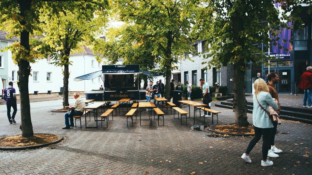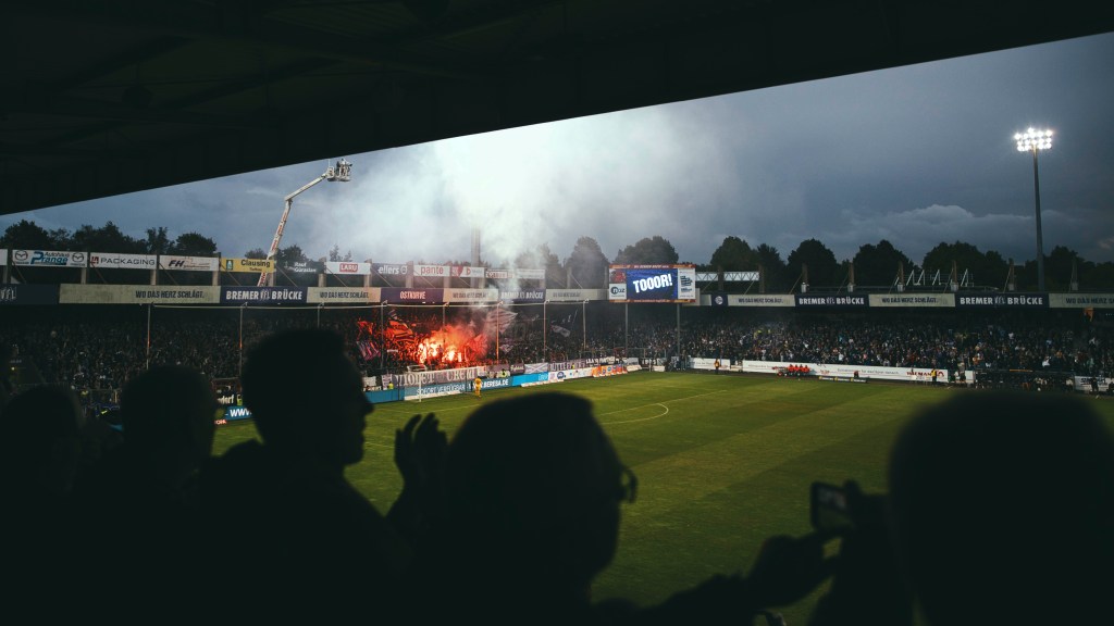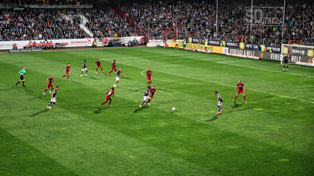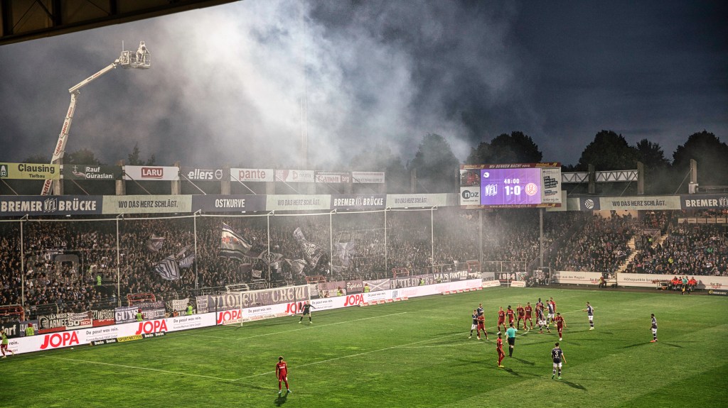 Ja und wenn dann auch noch das Flutlicht an, und die Sonne untergeht, beide gut aufgelegten Fanlager das ganze Szenario auch noch in etwas „Herbstnebel“ hüllen, dann weiß man, das man in einem der schönsten Stadien der Republik zu Gast ist. Auf jeden Fall das für mich zweitschönste der Liga. Ganz oben thront natürlich die Hafenstraße. Weil es zuhause immer am schönsten ist! Der Osnabrücker, die Osnabrückerin auf den Sitzplätzen im Spielverlauf übrigens etwas vornehmer unterwegs, als das bei uns der Fall ist. Es wird zwar genau so schnell gemeckert, aber es bedarf seine Zeit, bis man auch mal aus dem Sattel geht und sich an der allgemeinen Stimmung beteiligt. Mag ganz eventuell daran liegen, das definitiv und unwiderruflich viel weniger Bier konsumiert wird, als das an der Hafenstraße der Fall ist. Was sich möglicherweise dadurch erklären lässt, dass in Osnabrück Herforder Pils ausgeschenkt wird. Und man kommt natürlich auch schlecht wieder raus, wenn erstmal der Platz eingenommen wurde.
