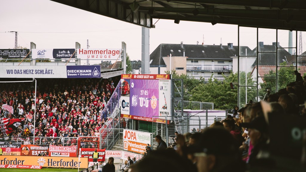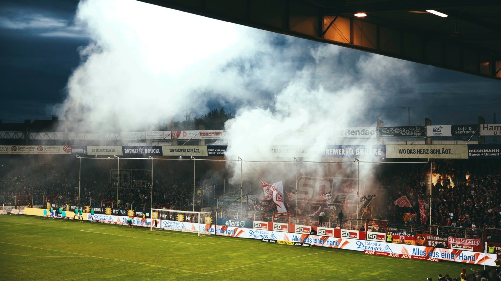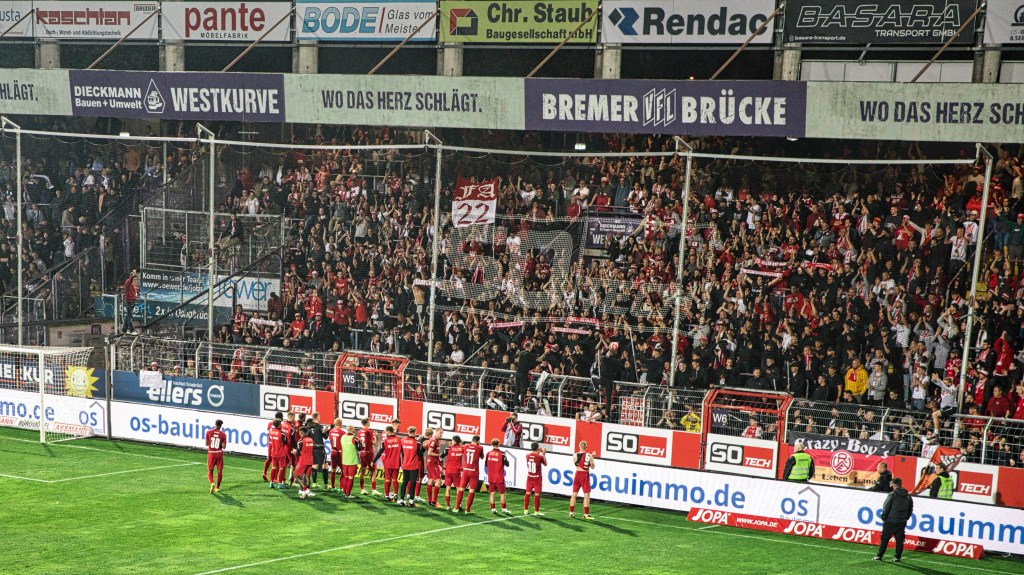 Das hat man sich wohl auch 1933 in Osnabrück gedacht, und das Stadion an der Bremer Brücke erbaut. Wohl eines der schöneren Ereignisse in diesem ziemlich bescheidenen Jahr. Die vergangenen drei Auswärtsspiele in der ersten und hoffentlich nicht vorerst letzten Saison in der 3. Liga brachten den reisefreudigen RWE-Fans Stadionerlebnisse, wie sie unterschiedlicher nicht sein konnten. Und sie wurden, einmal abseits der sportlichen Ergebnisse betrachtet, von Mal zu Mal schöner. Rein subjektiv betrachtet natürlich. Dem Monumentaltempel Westfalenstadion folgte das Oldschool-Erlebnis „HaWaWi“ in Bayreuth und mündete vergangenen Freitag im Osnabrücker Ortsteil Schinkel. Man hätte aber auch an der Kenilworth Road in Luton sein können, so tief die Tribünen der Brücke, und fast so nah die umgebenden Häuser.