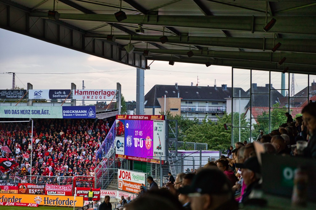 .„Eine enge Kiste“ Öl auf Leinwand, 2022. Spiele in Osnabrück sind eine enge Kiste. Damit ist nicht immer nur das Endergebnis gemeint, aber immer die herrliche „Bremer Brücke“ selbst: Jeder Quadratzentimeter des Stadions wird hier genutzt , um Zuschauern Platz zu bieten. Und dann ist die Brücke auch noch innerhalb eines Wohngebietes gelegen, so dass der Vergleich mit der „Kenilworth Road“ von Luton Town nicht ganz abwegig erscheint, wenngleich er natürlich ein wenig hinkt: Schließlich muß man den Gästeblock nicht durch Nachbars Garten betreten.