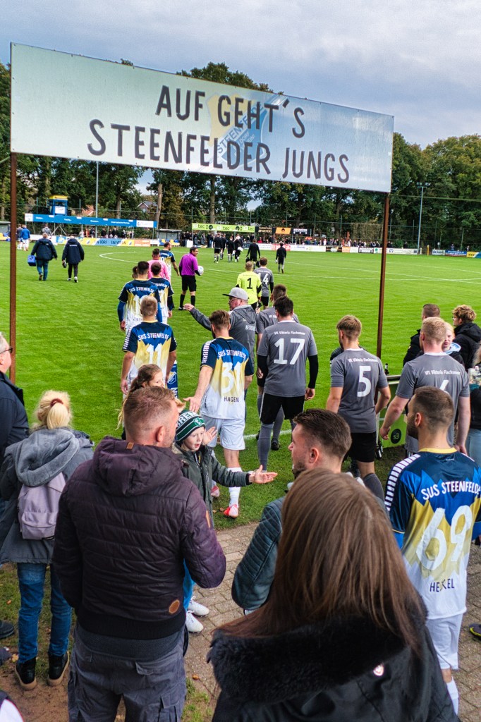 In Anbetracht der hohen Zugriffszahlen möglicherweise doch eher Personenkult als Fußball. Und genau das galt es herauszufinden, denn Personenkult ist einfach nicht meine Sache. Kultige Vereine mit schön gelegenen Fußballplätzen und dem Charme besserer Tage im Miteinander dafür umso mehr. Das mir beispielsweise Selfies erst gar nicht in den Sinn kommen, musste 1982 schon leidvoll Diego Maradona in Meppen erfahren. Ich wollte das nicht, da hätte „El Pibe de Oro“ damals noch so bitten können. Der RWE im Pokal in Hilden kam klar, wenngleich auch mühevoll, somit war der Weg frei für den Besuch des Spitzenspiels in der Ostfrieslandklasse B4: Der SuS Steenfelde empfing die Zwote des Ortsnachbarn und Tabellenführers VfL Viktoria Flachsmeer. Mehr Derby geht kaum in Ostfriesland.