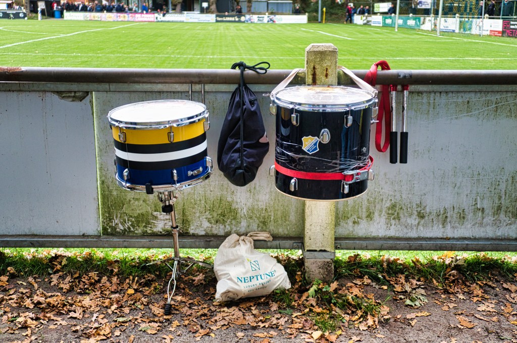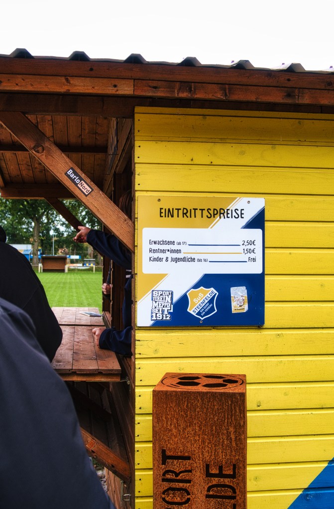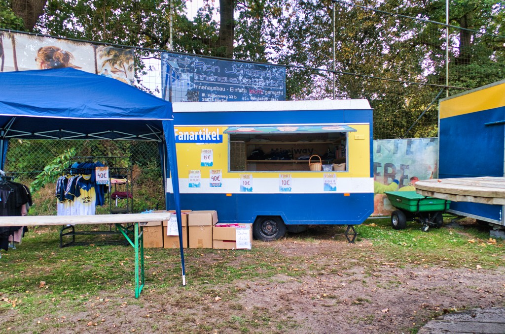 Was einen aber wirklich abholt, dass sind die Maße des Spielfeldes. Dieses ist niemals rechteckig, die beiden Tore stehen sich zwar gegenüber, aber nicht wirklich direkt. Kann man nicht beschreiben, muss man selbst erlebt haben. Mein innerer Monk in Sachen Symmetrie ist fast kollabiert. Dazu die modernen Spieler- und Trainerbänke auf Rollen links und rechts neben einem Hochsitz als Sprecherkabine, der selbst auf freier Wildbahn keine TÜV-Abnahme bekommen dürfte. Komplettiert mit einer kleine Tribüne und Werbetafeln in so großer Zahl rundherum, dass selbst die Vertriebler bei RWE blass vor Neid um die Nase werden dürften. Abgerundet das Ganze dann um einen kleinen Marktplatz bestehend aus Fanshop (alter Camper) und Verköstigung. Und nicht wenige Zuschauer trugen Trikots (die Harten) oder Steppjacken (die Weichen) des gastgebenden SuS. Ansonsten waren Heim- und Auswärtsfans nicht sonderlich zu unterscheiden: Das lakonische „Moin“ und grundsätzlich entspannte ostfriesische Naturell war allen gemein.