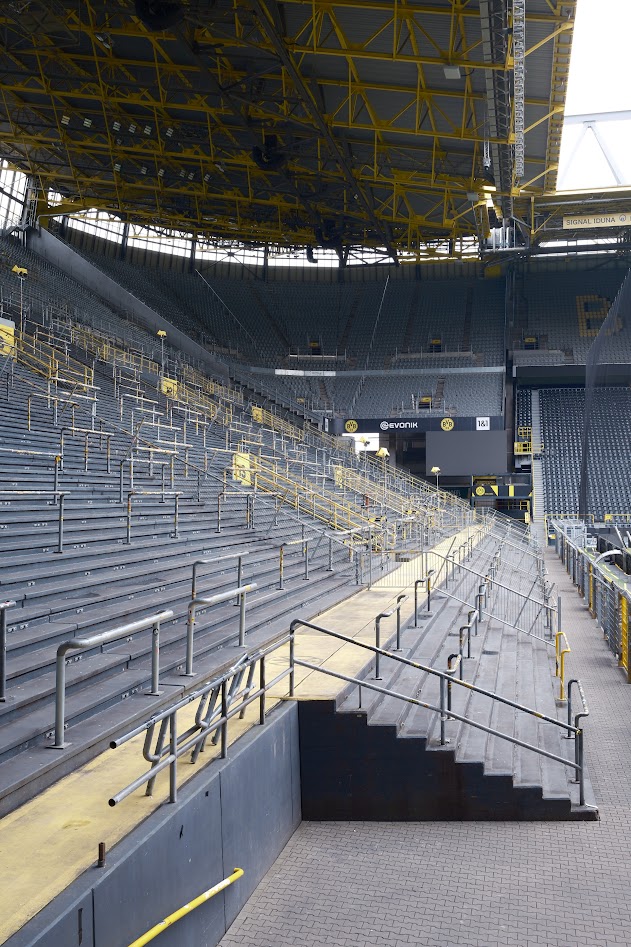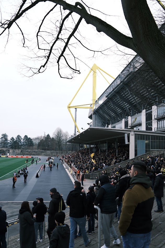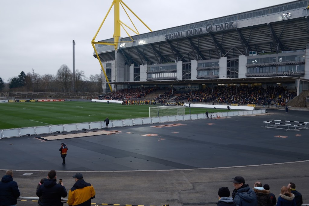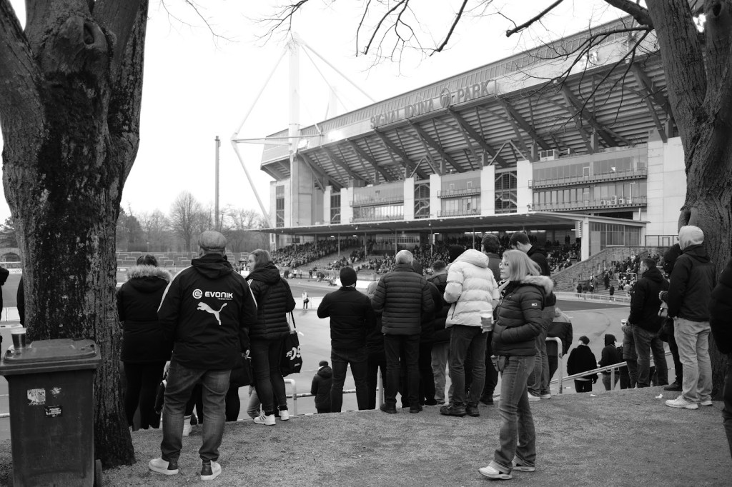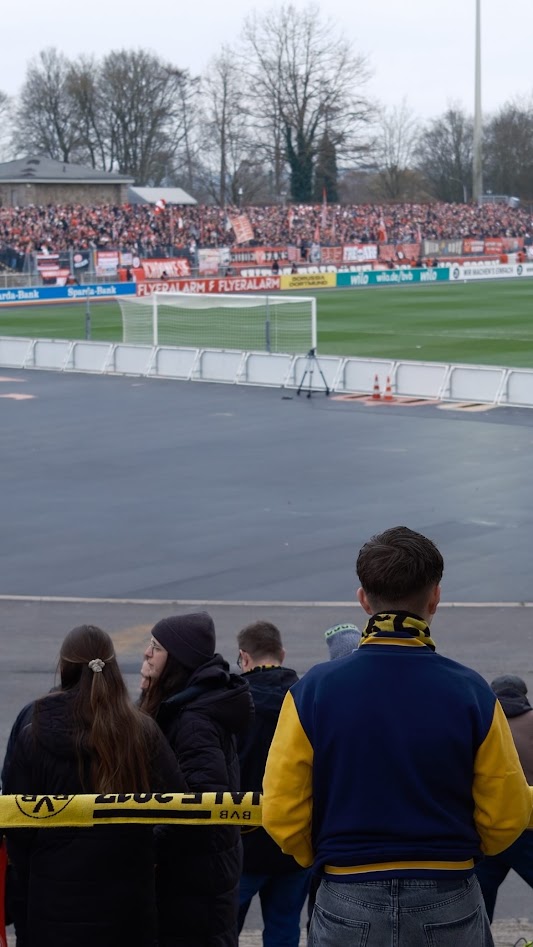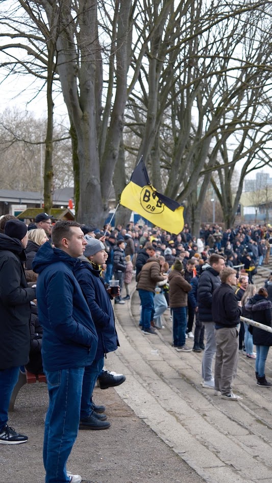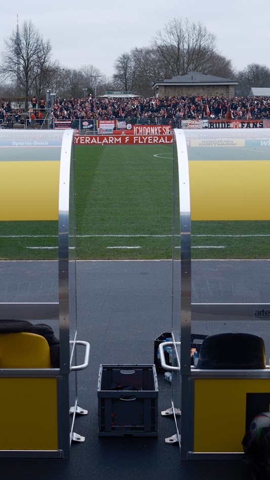 Teil 2: Das Stadion Rote Erde. Auf seiner Tribünenseite fast erdrückt durch das monströse Biest Westfalenstadion. Nicht wenige sehen übrigens gerade in diesem Zusammenspiel beider Stadien den optischen Reiz. Separiert betrachtet ist das Stadion Rote Erde weiterhin eines der schönsten Stadien der Republik, um entspannt professionellen Fußball zu schauen. Und das, ohne auch nur irgendeine Aktie in Richtung BVB zu haben. Vielleicht war es am Ende doch nur die lässige Atmosphäre zwischen den Fans von Rot-Weiss und dem BVB, die das Erlebnis Rote Erde an diesem kalten Samstag Nachmittag komplettiert hat. Schließlich waren martialisch auftretende Hundertschaften der Polizei kaum auszumachen und auch die Sturmhauben in den jeweiligen Vereinsfarben hatten frei.