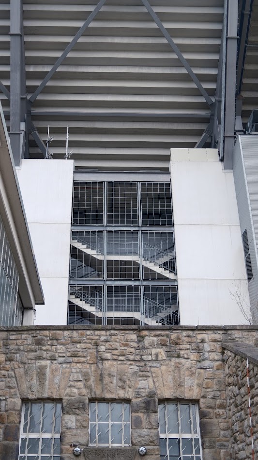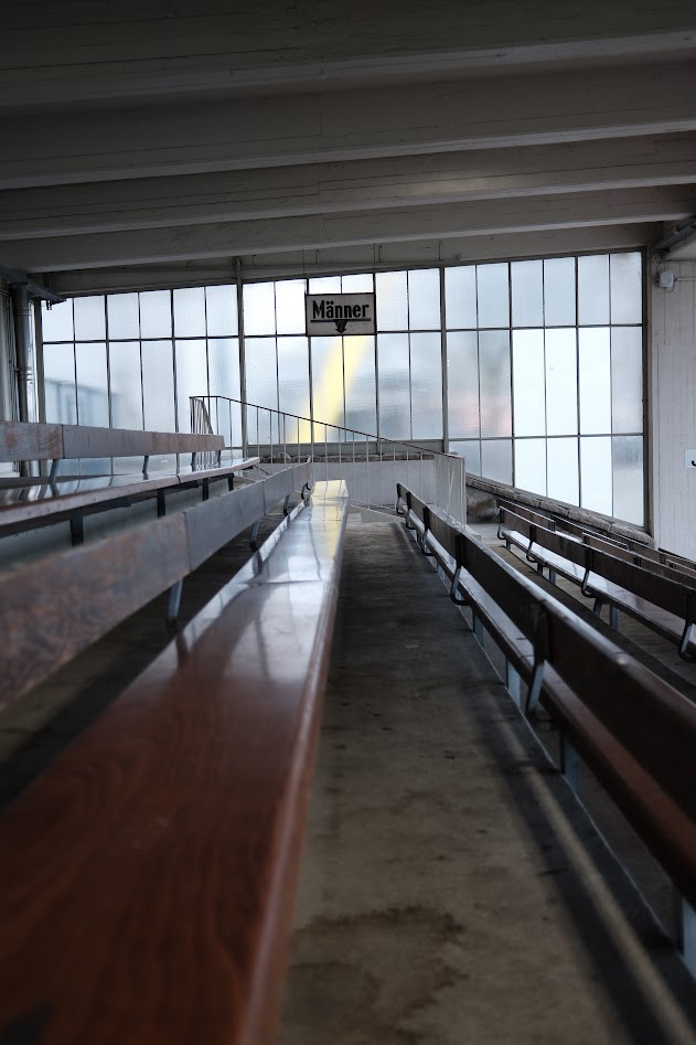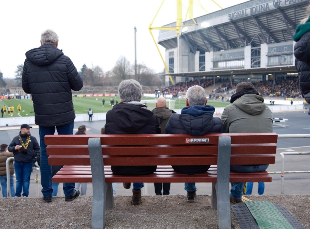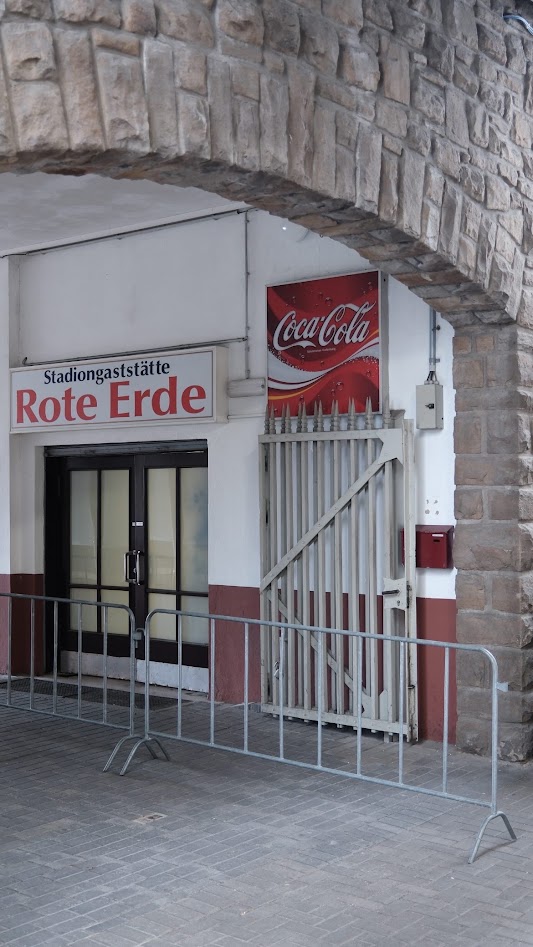 Es war also irgendwann völlig Latte, welchen Schal man (oder Frau) in den jeweiligen Bereichen des Stadions trug. Der Versuch kompetenter Fantrennung scheiterte spätestens dann, als Fans mit ausgebleichten Freundschaftsschals beider Vereine den Biergarten im Stadion betraten. In das Stadion Rote Erde kommt sicherlich überproportional der Kinderwagen mit und dürfen Kinder bisweilen selbst testen, wie (Rote) Erde schmeckt, da das Spiel als solches noch nicht so von Interesse. Lakonische Antwort des Vaters hier auf den Protest der Mutter: „Wenn es denn schmeckt, ist doch alles gut“ Es ist also ein wunderbarer Ort, um Fußball in seiner ursprünglichsten Form anzuschauen. Man fühlt die Massen vor Jahrzehnten auf diesen Traversen. Männer, nicht Herren, haben ihre eigenen Toiletten und Frauen auch.